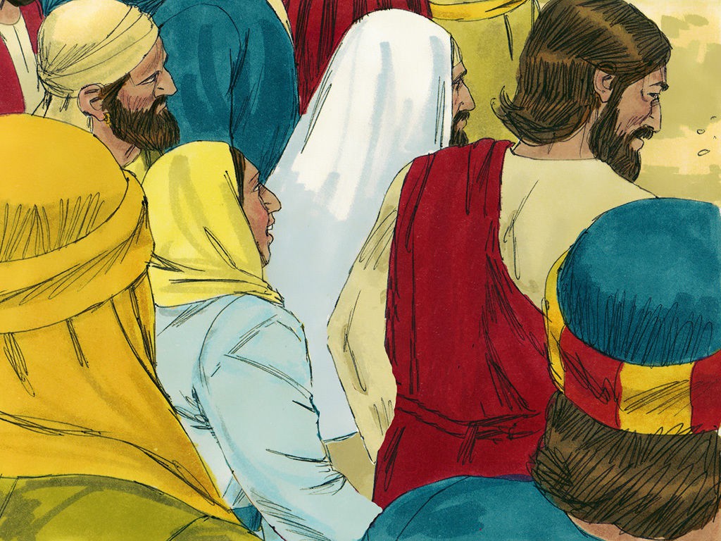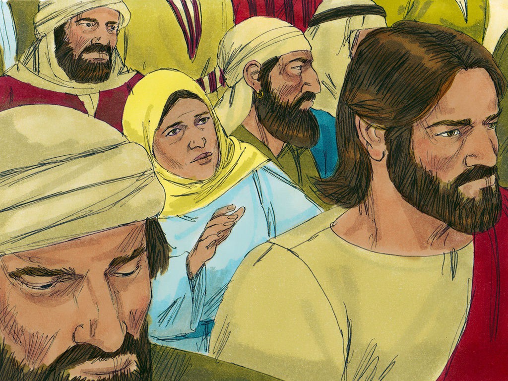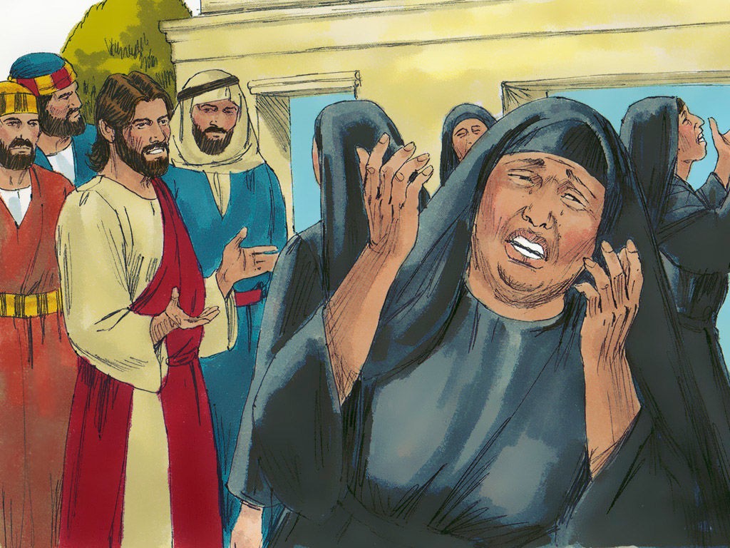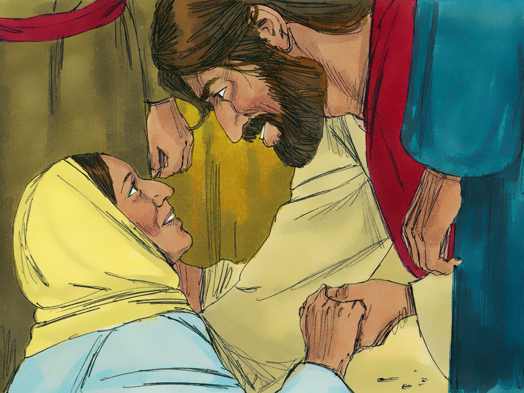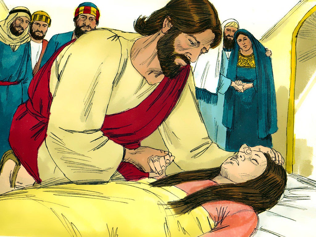 女人摸耶稣的衣裳得痊愈。耶稣使睚鲁女儿从死里复活。