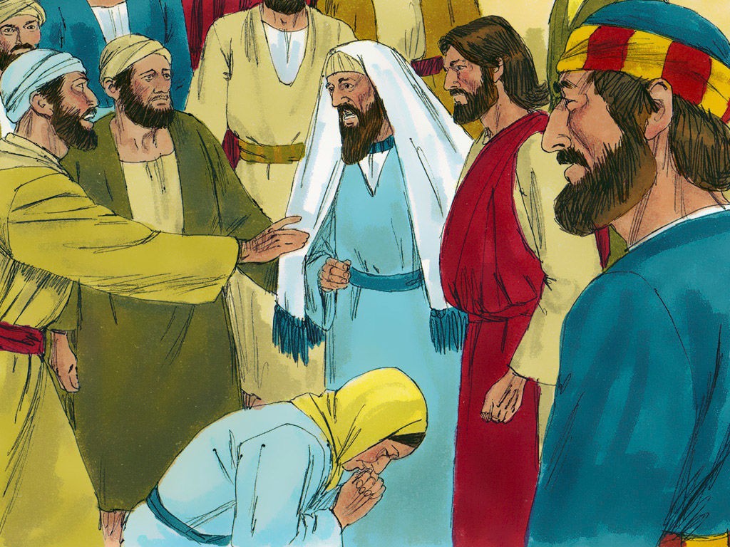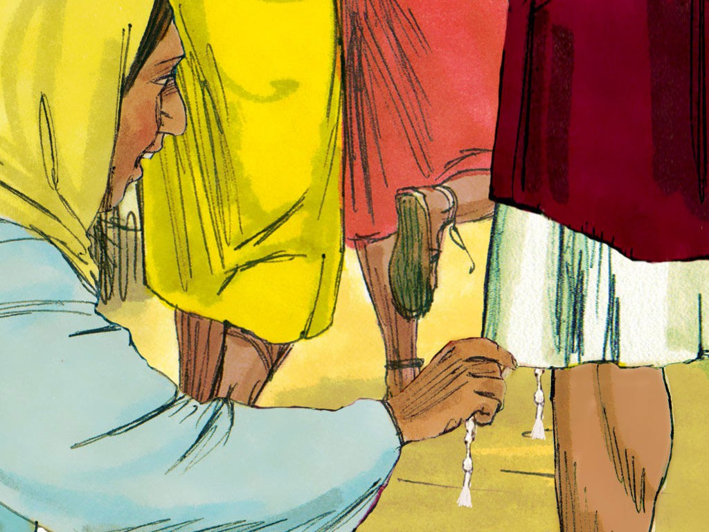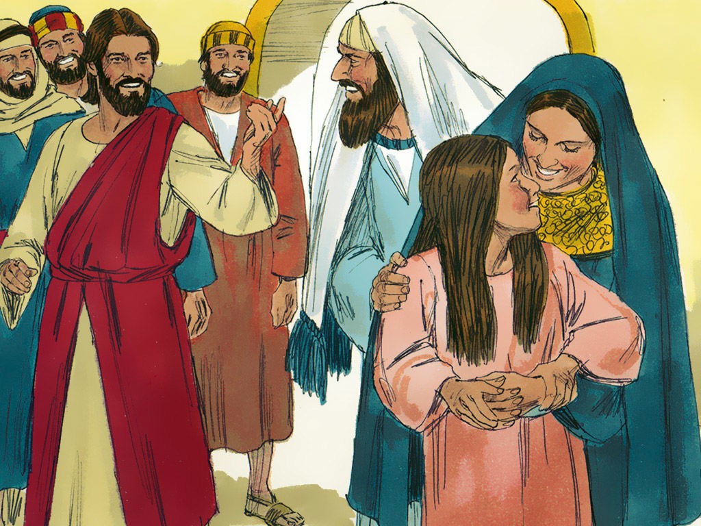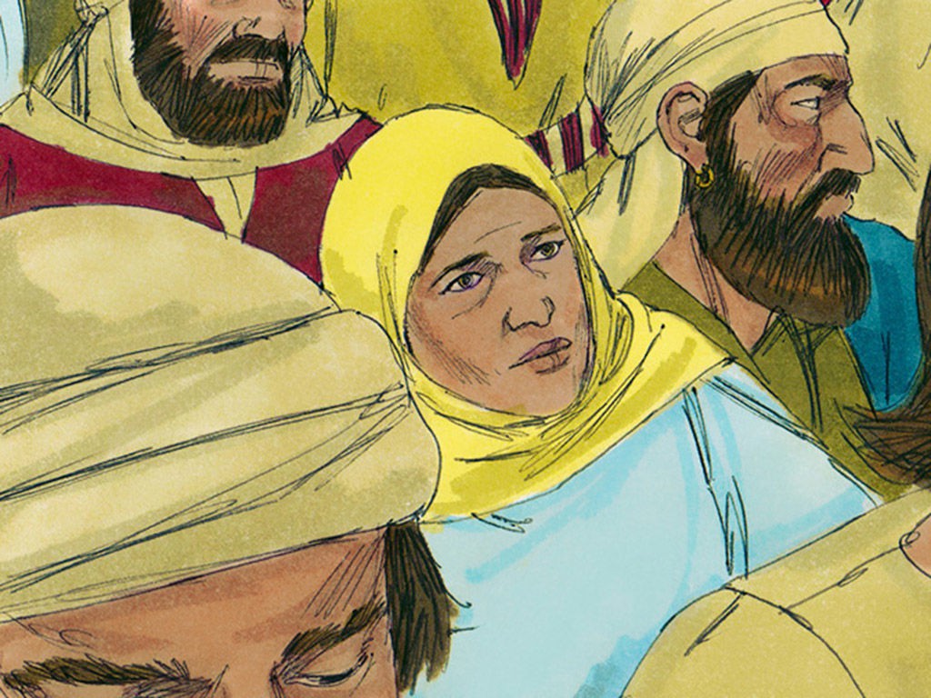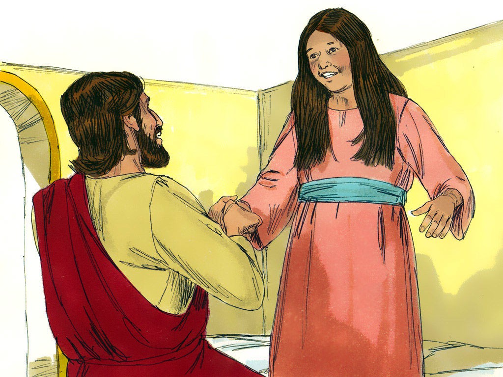 女人摸耶稣的衣裳得痊愈。耶稣使睚鲁女儿从死里复活。